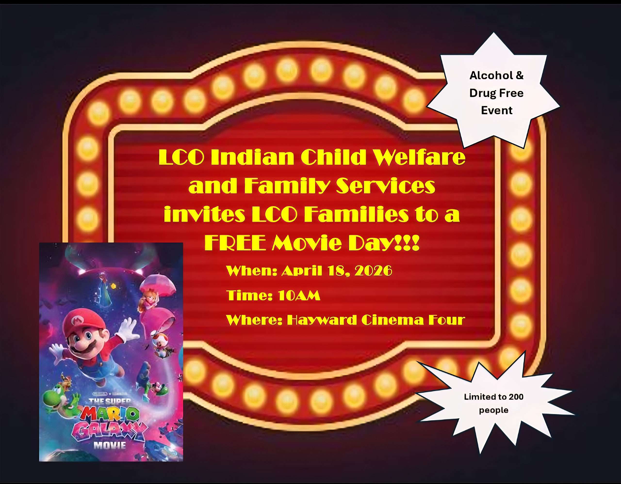 Saturday, April 18, 2026 | 10:00 am @ Hayward Cinema Four Indian Child Welfare and Family Services invites LCO Families to a FREE Movie Day to watch The Super Mario […]