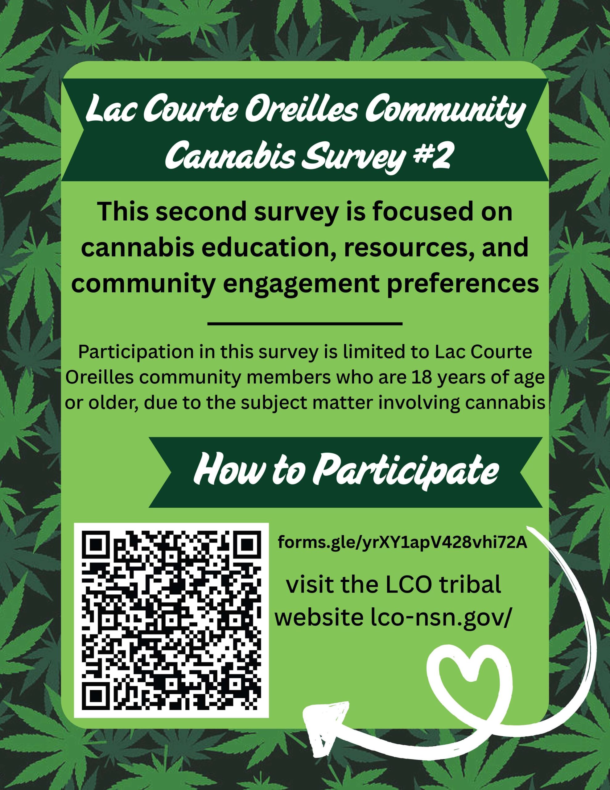 The Lac Courte Oreilles Community Cannabis Committee (LCO CCC) invites community members to participate in this second survey focused on cannabis education, resources, and community engagement preferences .