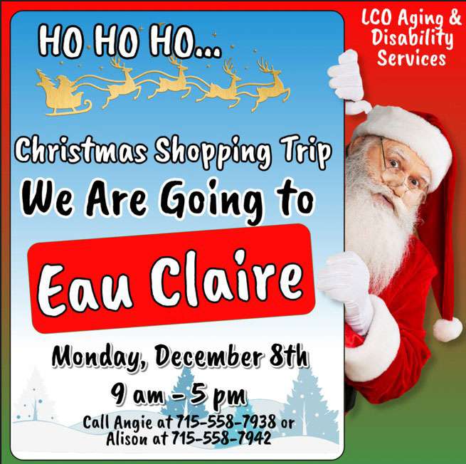 Join us for a Christmas Shopping Trip to Eau Claire! We will be going to Kohl’s and Target and taking requests for a third stop. We need a minimum of 5 people to sign-up to take the trip.
