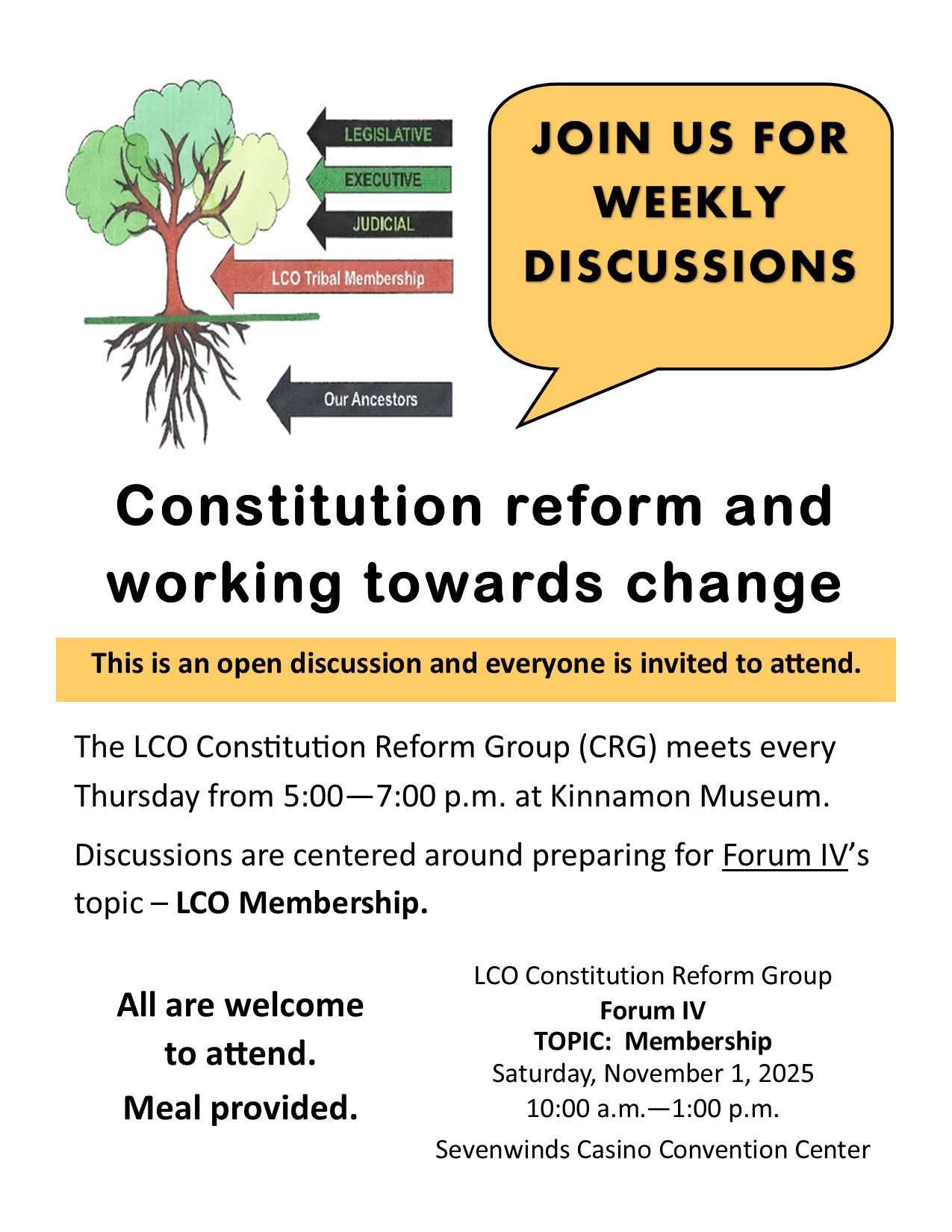 Nov 6 5:00 pm - 7:00 pm LCO Constitution Reform Group LCO Elder's Council Kinnamon School Museum N8493 N County Hwy E, Hayward Event Details Get Directions